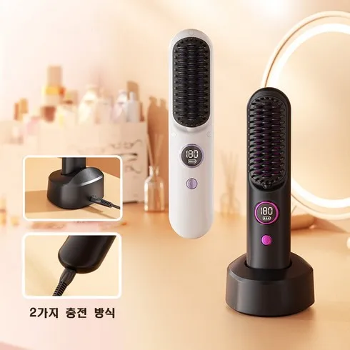미니 무선 고데기 3단조절 휴대용 빗고데기 스마트 온도 제어 매직기 화상 방지 앞머리 고데기, 블랙