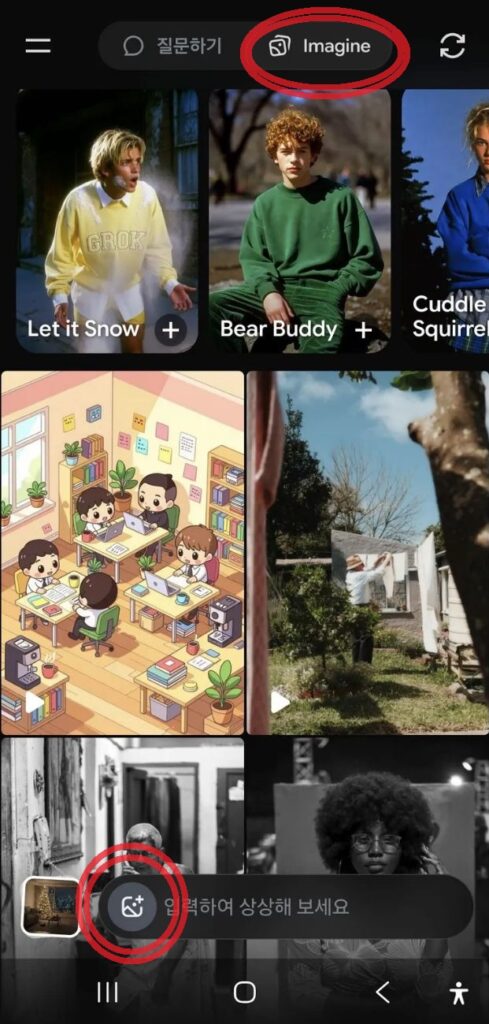 앱 하단 메뉴에서 반드시 [상상하기(Imagine)] 아이콘을 클릭해야 합니다. 일반 대화 창에서는 영상 생성이 제한될 수 있으니 주의하세요.